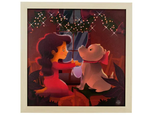 Crafted from quality canvas and framed in wood, this charming art piece is perfect for any holiday decor. It comes ready to hang and includes all necessary 2 cell batteries. Packaged securely in shrink wrap, it measures 13" x 13" for easy placement in your home.