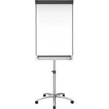 Mobile presentation easel features a versatile design that can be used as a magnetic whiteboard, magnetic bulletin board and flip-chart stand. Total Erase surface resists ghosting and staining to maintain a lasting professional appearance. Height-adjustable construction allows you to quickly change the height for better visibility for everyone in the room. Smooth-rolling, star-base wheels allow quick, easy mobility. Flip-chart holders support all standard-size flip charts (sold separately).