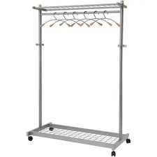 Practical and elegant coat rack holds up to 36 coat hangers. Two shelves, one above and one below the rack, are perfect for umbrellas, bags and other accessories. Design also includes four wheels for easy mobility and steel structure with silver powder-coat finish. Easy-to-assemble coat rack includes six hangers and hooks.