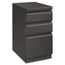 Mobile pedestal with HON Brigade Series 800 lateral-pull design fits under standard HON Initiate, 38000 Series and 29-1/2" worksurfaces. Freestanding pedestal offers one file drawer and two box drawers. High-sided file drawer features two crossrails and accommodates front-to-back filing for letter-size, hanging file folders. Each box drawer has one adjustable divider and a pencil tray. Charcoal gray pedestal also offers a 22-7/8" depth, ball-bearing suspension on the file drawer (90 percent extension), and roller suspension on two box drawers (75 percent extension). Counterweight inhibits tipping when opening more than one drawer. Pedestal is also equipped with a HON One Key interchangeable, core-removable lock; fixed front casters; and swivel rear casters. Pedestal meets or exceeds ANSI/BIFMA and ISTA performance standards.