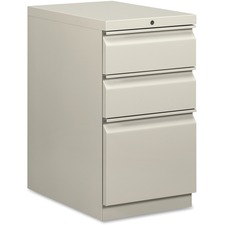Mobile pedestal with HON Brigade Series 800 lateral-pull design fits under standard HON Initiate, 38000 Series and 29-1/2" worksurfaces. Freestanding pedestal offers one file drawer and two box drawers. High-sided file drawer features two crossrails and accommodates front-to-back filing for letter-size, hanging file folders. Each box drawer has one adjustable divider and a pencil tray. Light gray pedestal also offers a 22-7/8" depth, ball-bearing suspension on the file drawer (90 percent extension), and roller suspension on two box drawers (75 percent extension). Counterweight inhibits tipping when opening more than one drawer. Pedestal is also equipped with a HON One Key interchangeable, core-removable lock; fixed front casters; and swivel rear casters. Pedestal meets or exceeds ANSI/BIFMA and ISTA performance standards.