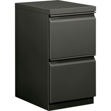 Mobile pedestal with HON Brigade Series 800 lateral-pull design fits under standard HON Initiate, 38000 Series and 29-1/2" worksurfaces. Freestanding pedestal offers a 19-7/8" depth and two file drawers with ball-bearing suspension (90 percent extension). High-sided file drawers feature two crossrails and accommodate front-to-back filing for letter-size, hanging file folders. Counterweight inhibits tipping when opening more than one drawer. Charcoal gray pedestal is also equipped with a HON One Key interchangeable, core-removable lock; fixed front casters; and swivel rear casters. Pedestal meets or exceeds ANSI/BIFMA and ISTA performance standards.