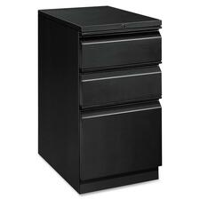Mobile pedestal with HON Brigade Series 800 lateral-pull design fits under standard HON Initiate, 38000 Series and 29-1/2" worksurfaces. Freestanding pedestal offers one file drawer and two box drawers. High-sided file drawer features two crossrails and accommodates front-to-back filing for letter-size, hanging file folders. Each box drawer has one adjustable divider and a pencil tray. Black pedestal also offers a 19-7/8" depth, ball-bearing suspension on the file drawer (90 percent extension), and roller suspension on two box drawers (75 percent extension). Counterweight inhibits tipping when opening more than one drawer. Pedestal is also equipped with a HON One Key interchangeable, core-removable lock; fixed front casters; and swivel rear casters. Pedestal meets or exceeds ANSI/BIFMA and ISTA performance standards.