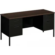 Double-pedestal desk with rectangular top is part of HON 10500 Series Wood Laminate Desking that offers practical functionality and uncompromising durability. Durable, 1-1/8" solid-core, high-performance particleboard resists warping. Laminate is scratch-resistant, stain-resistant and spill-resistant. Desk features full-height modesty panel and 3/4 pedestal with one box and one file drawer. Drawers lock and offer five-sided construction for easy drawer alignment or replacement of drawer fronts. Interchangeable, core-removable lock makes rekeying quick and easy. Box drawers operate on ball-bearing suspension with 3/4 extension while the file drawers extend fully on ball-bearing suspension. Included hangrails are designed for side-to-side, letter-size or legal-size filing and front-to-back letter-size filing. Two round grommets (3") in the desktop offer easy cord management.