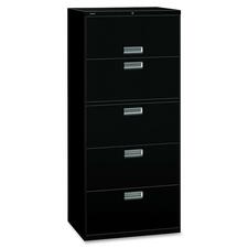 Five-drawer lateral file offers exceptional construction with double-walled base construction for maximum rigidity. Baked enamel finish over rust-inhibiting, phosphate pretreatment adds more durability. Telescoping, ball-bearing suspension delivers remarkably smooth drawer operation. The drawers accommodate letter-size or legal-size folders from side-to-side with included adjustable hangrails. Drawers are flush at the top and sides and feature drawer-extension restraint and aluminum, recessed drawer pulls. Mechanical interlock allows only one drawer to open at a time. The top drawer is a roll-out shelf for side-to-side filing. Lateral file also offers four adjustable leveling guides for stabilizing; HON One Key interchangeable, core-removable lock; and reinforced case steel construction. Lock mechanism secures both sides of drawers.